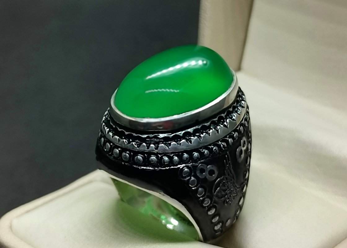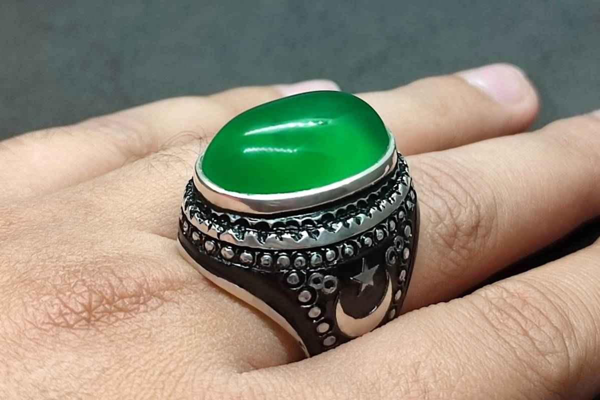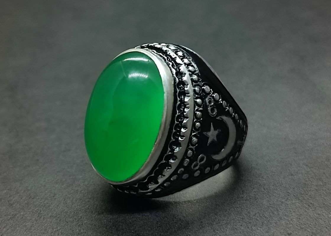Green Agate Turkish Ring – Natural Yemeni Big Aqeeq Handmade for Men, Sterling Silver 925 Islamic Design, 14k & 18k Gold Heavy Crescent Design